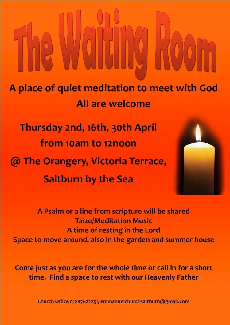 All are welcome in the Waiting Room. It will be a quiet time with God. A time to fix our thoughts and our hearts on Jesus. A psalm or a line of scripture will be shared, there will be Taize/meditation music playing. There will be bibles, reading material and notebooks.